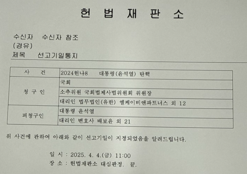 헌법재판소는 4월 4일 금요일 오전 11시에 대심판정에서 윤석열 대통령 탄핵 사건에 대한 선고를 진행합니다. 선고는 방송사를 통해 생중계될 예정이며, 일반인 방청도 가능합니다.